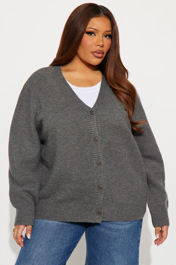 A soft, grey cardigan designed for comfort and style, offering a relaxed fit and versatile layering option for any outfit.